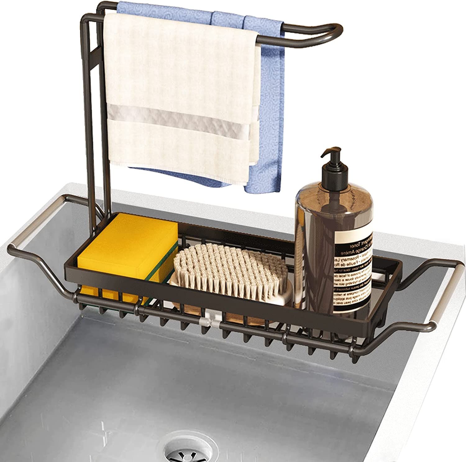 - elescopic Caddy Sink Design: Our telescopic sink rack is extensible, suitable for most standard sink which inside length is 14.2 to 21 inch. You can be placed horizontally and vertically. It is not only to storage soap, brush, scrubber and sponge, but also have towel rack to make dishcloth and rag air dry faster!